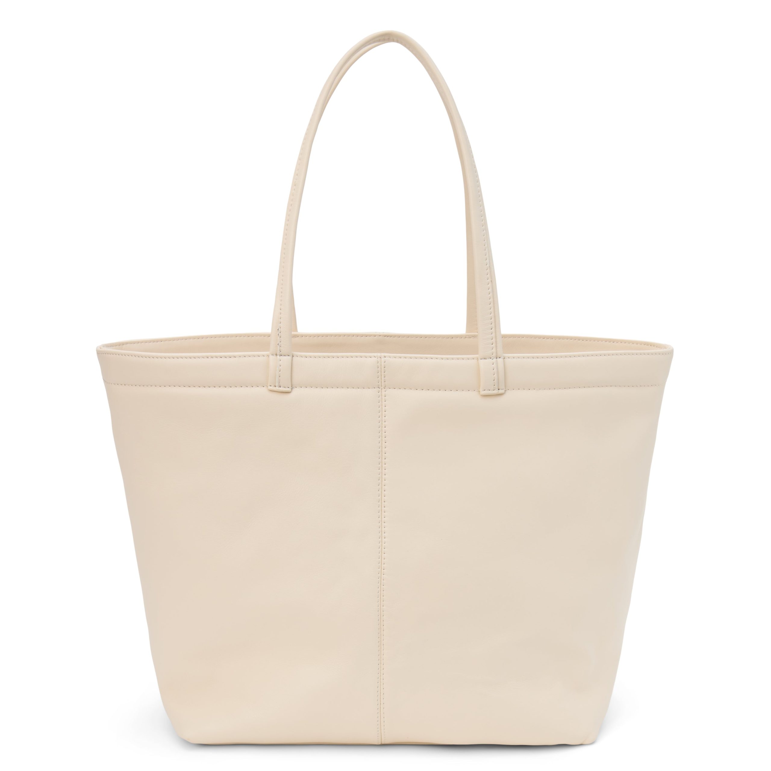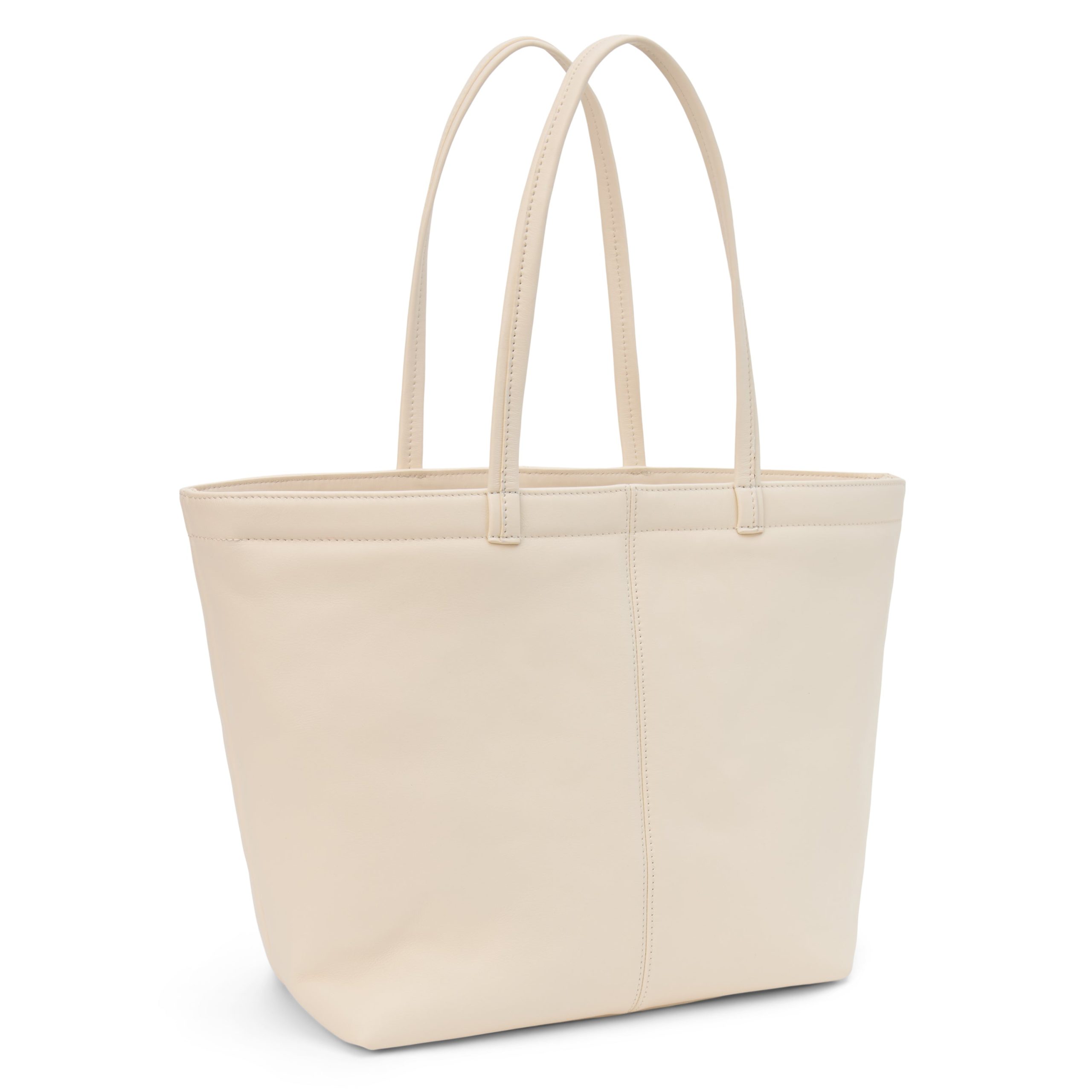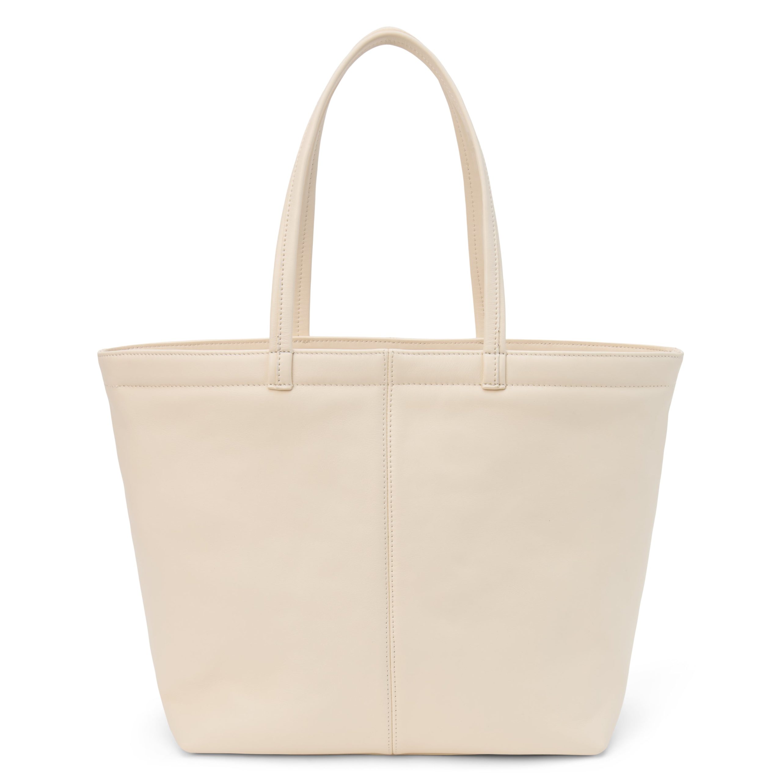 Large leather tote bag with interior slip and zipper pockets.
