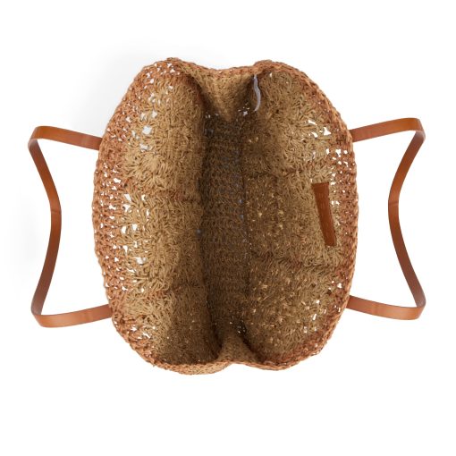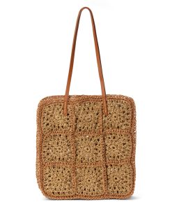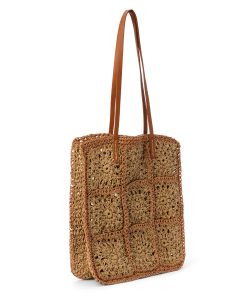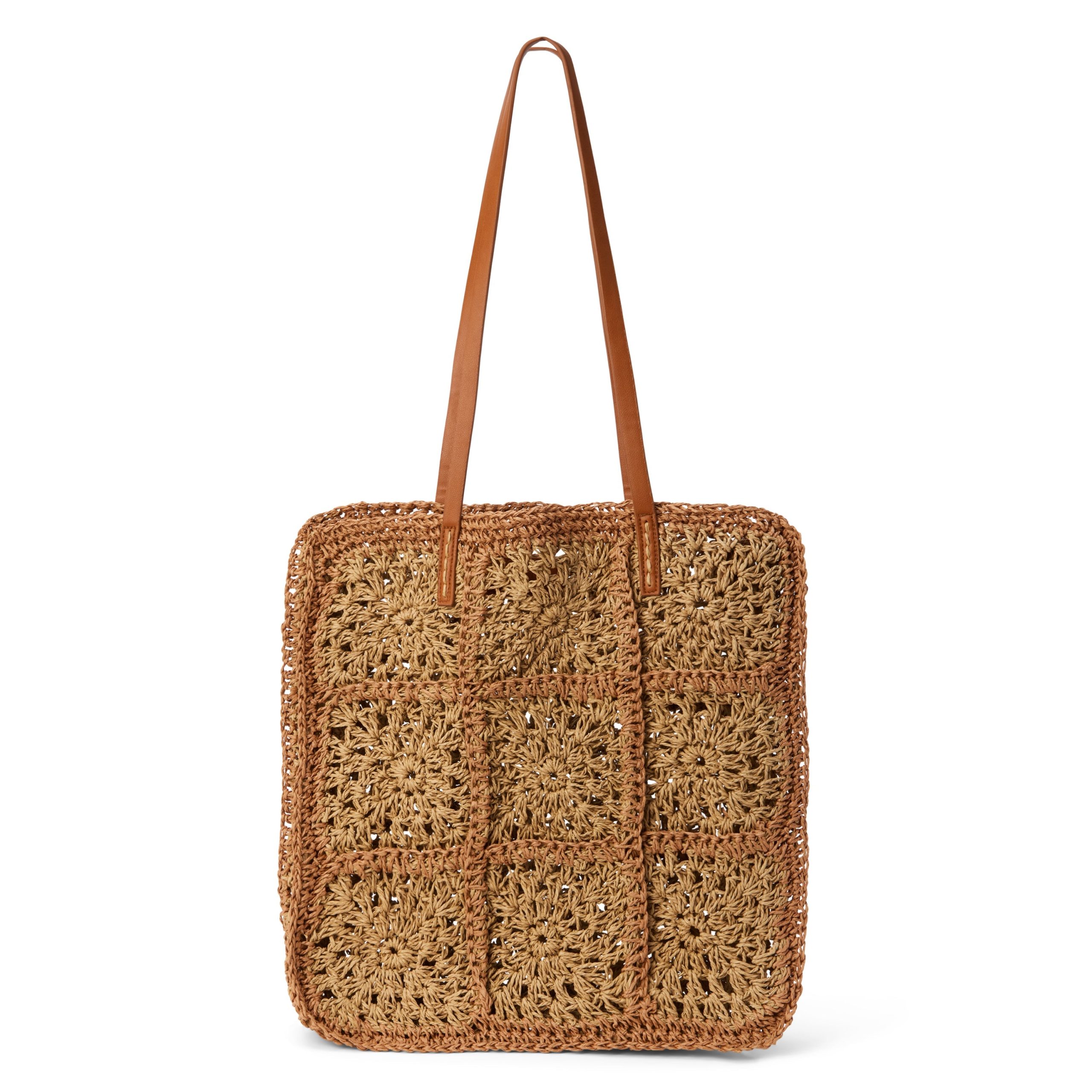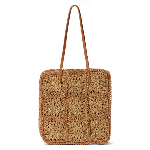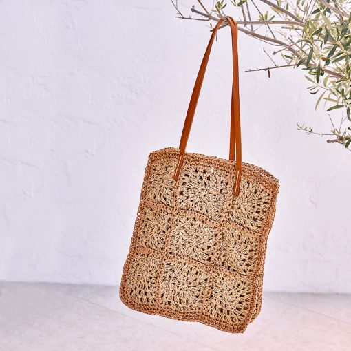 Vegan macramé tote bag with leather straps and a square grid pattern, perfect for beach outings or casual day trips.