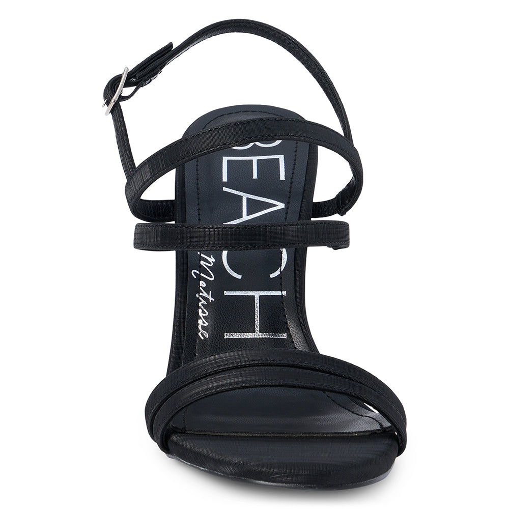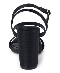 Vegan strappy sandal amplified with a rounded heel.