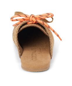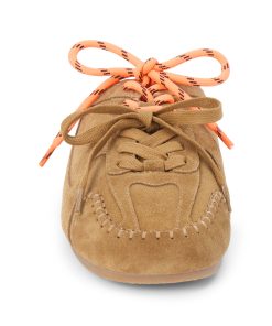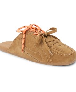 Suede mule with moccasin-style stitching, sporty lace-up detail, and open back. A laid-back hybrid silhouette blending slipper comfort with sneaker edge.