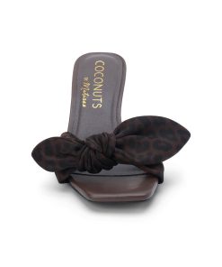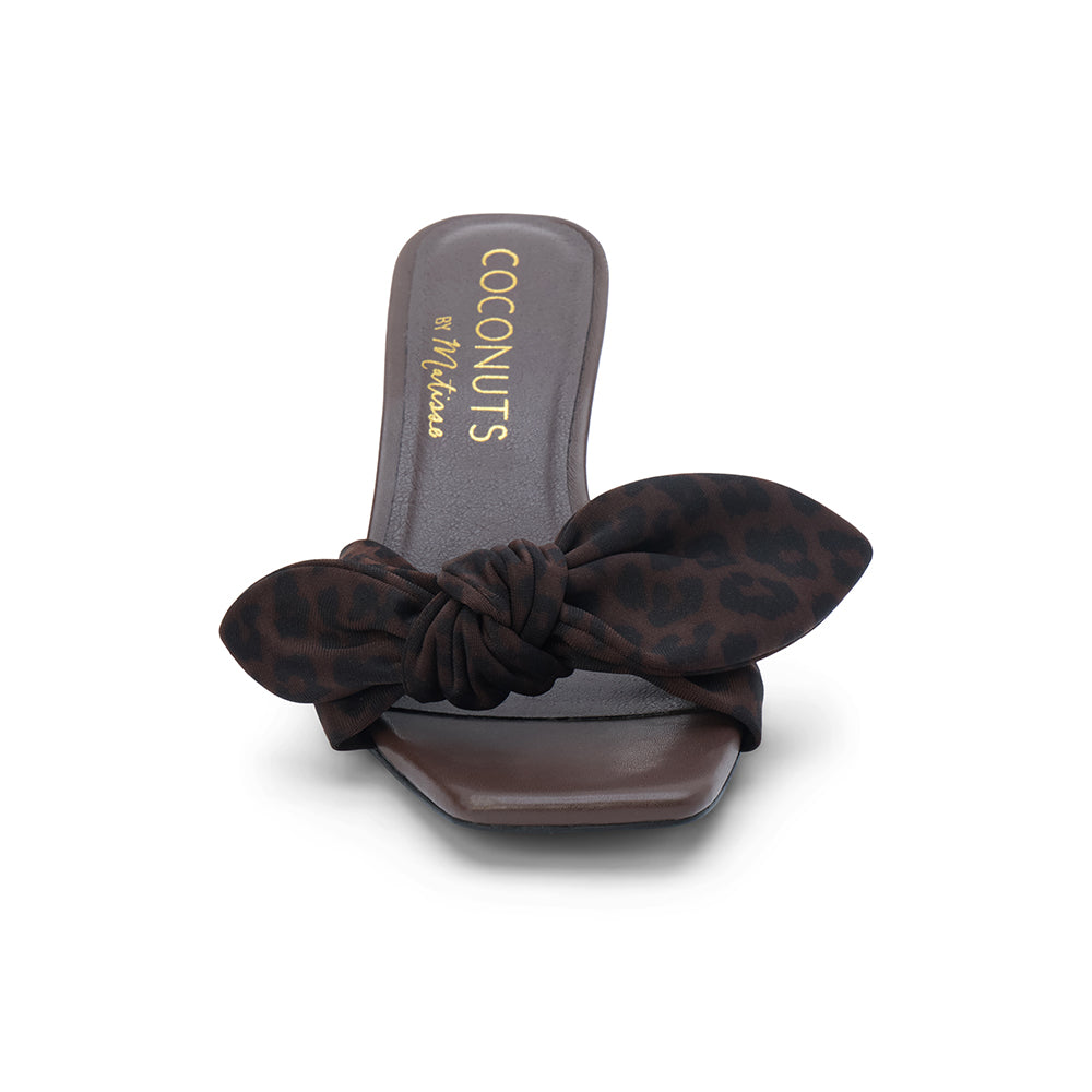 Brown slip-on sandal with square toe, leopard print bow strap, and tapered kitten heel.