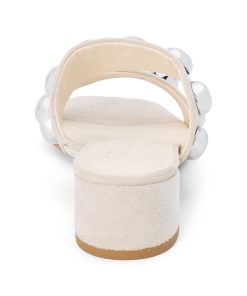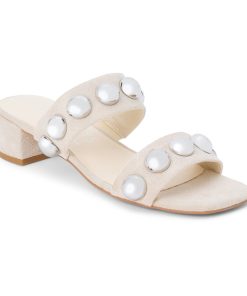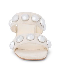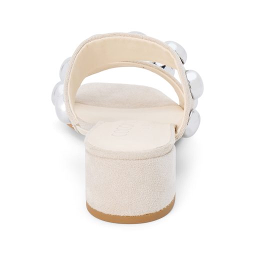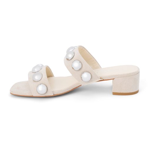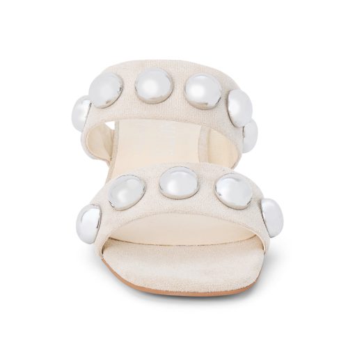 Vegan two-strap sandal with oversized dome studs and low block heel.