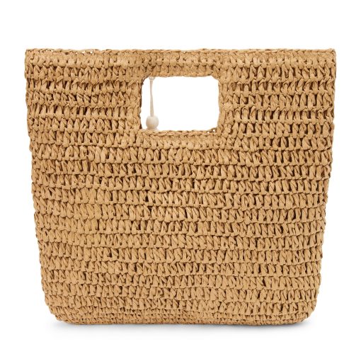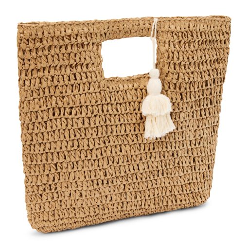 Vegan woven raffia tote bag with a cutout top handle and tassel ornament, offering a stylish and practical accessory for summer or beach outings.