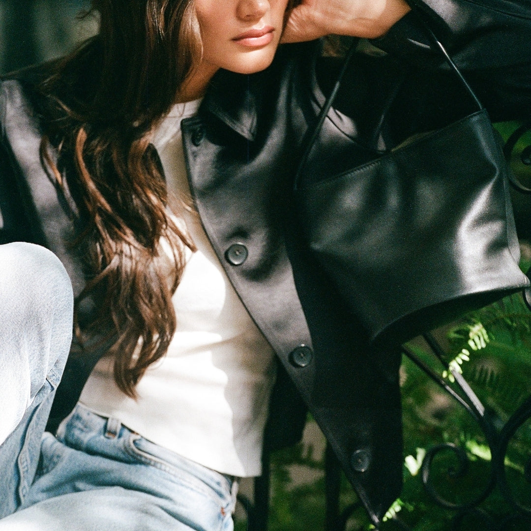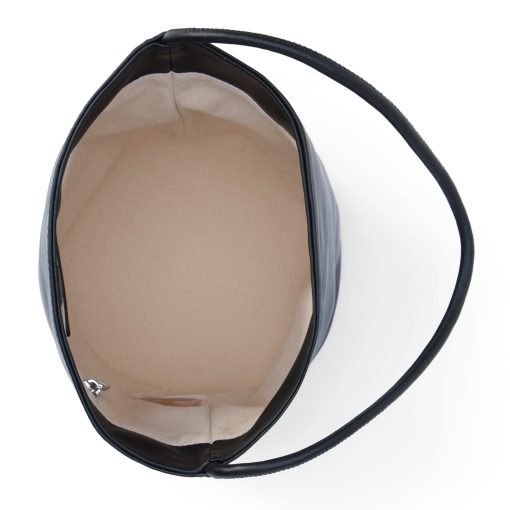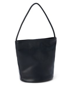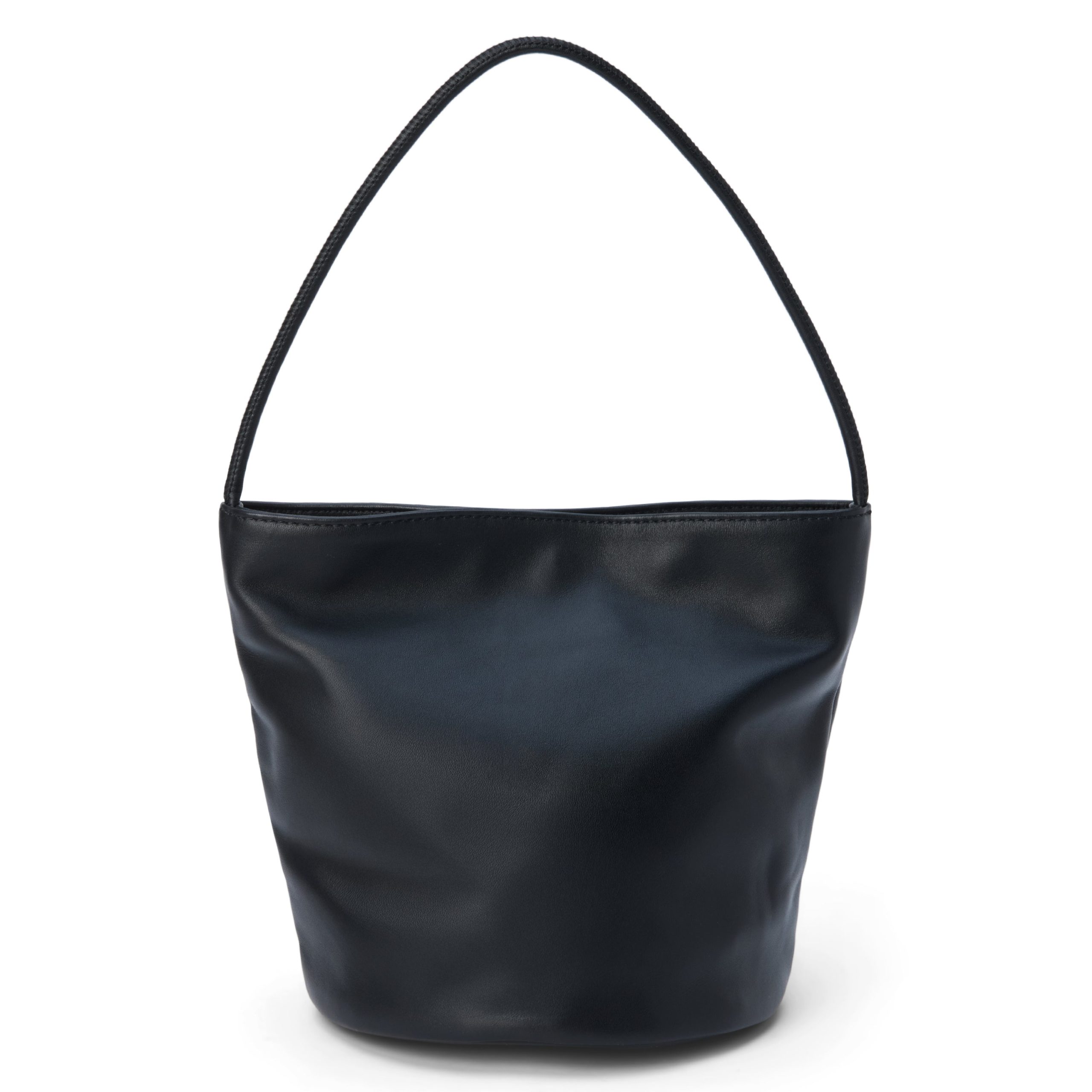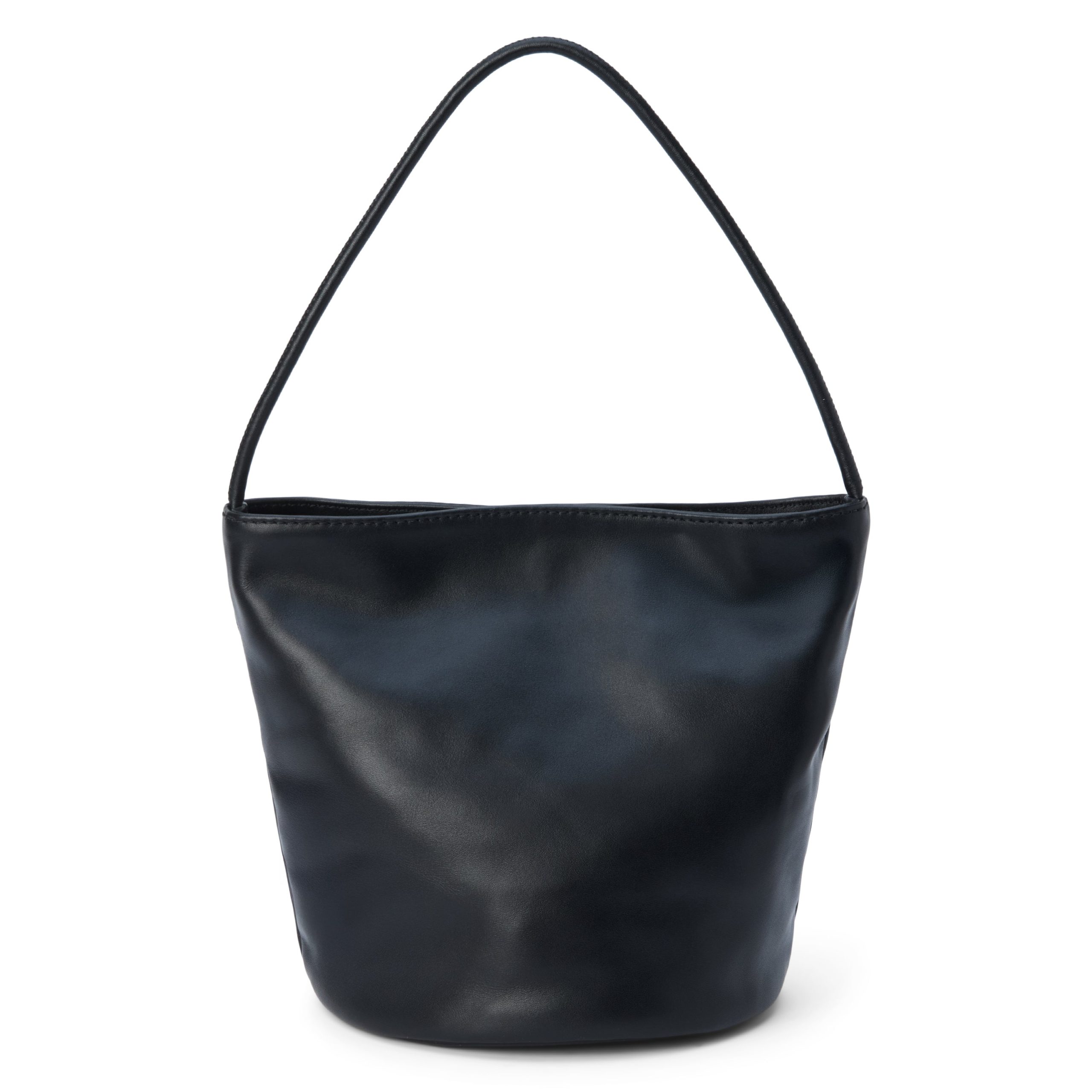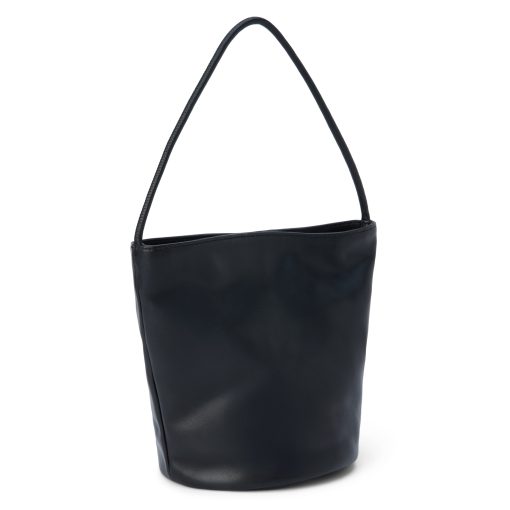 Small leather bucket bag with interior wall pocket and magnetic closure.