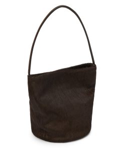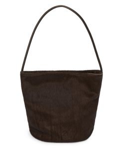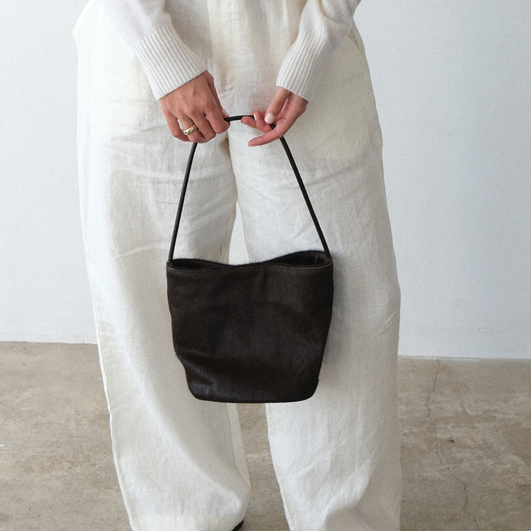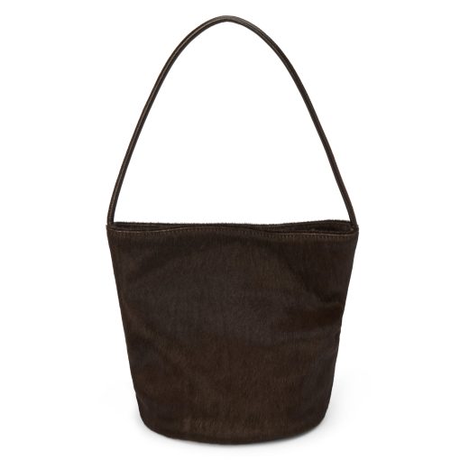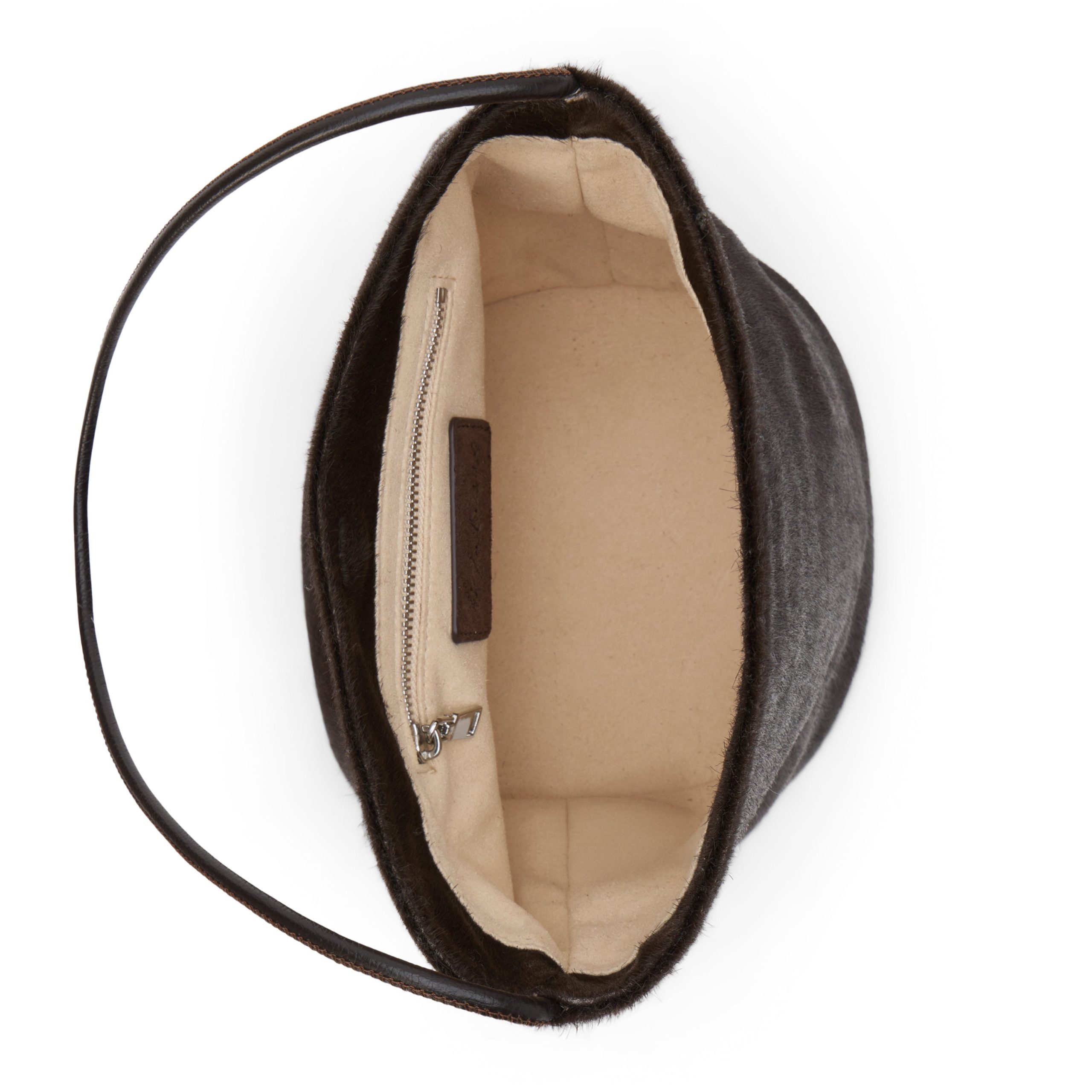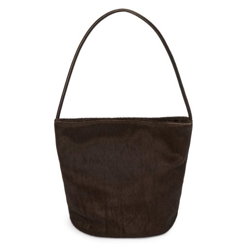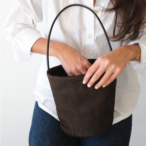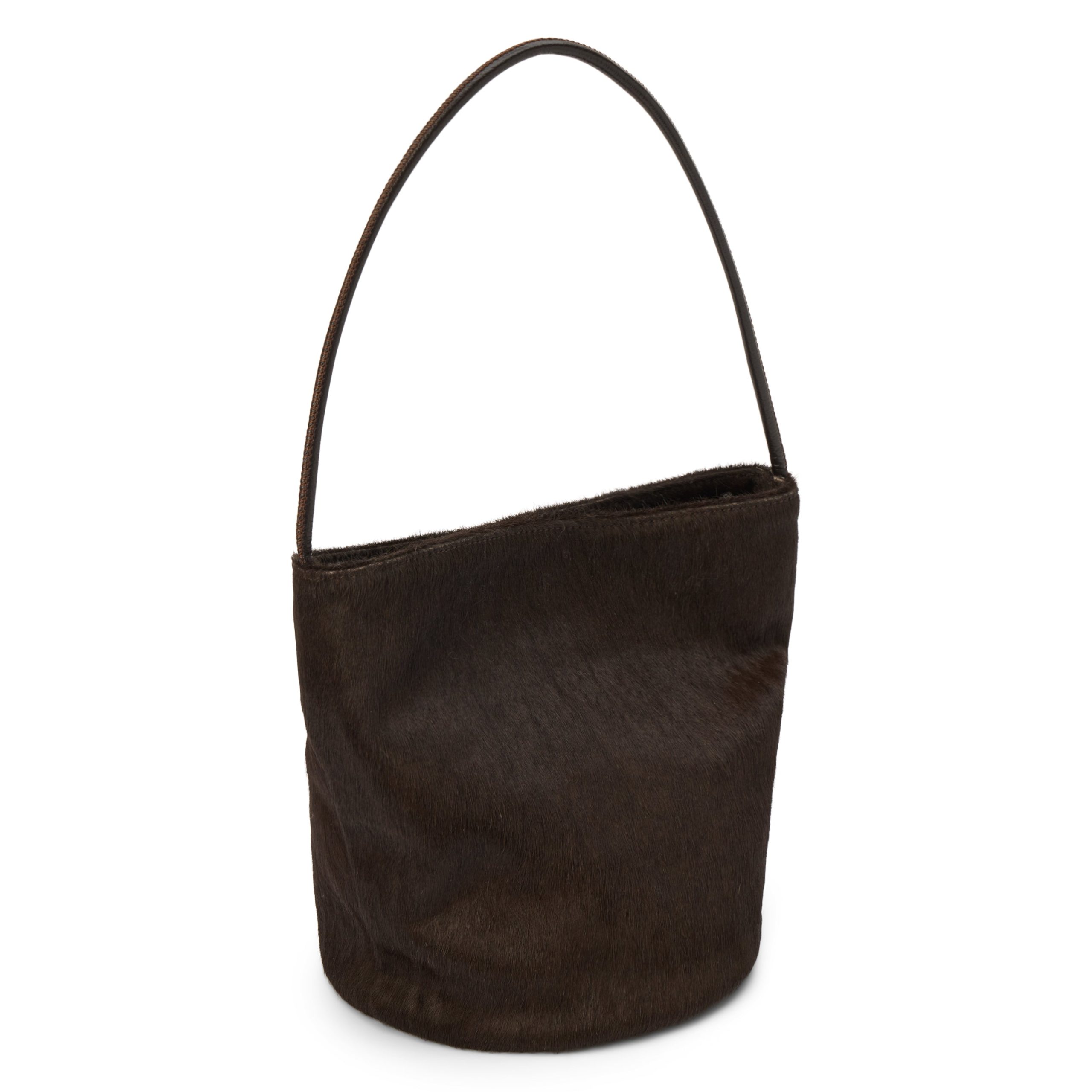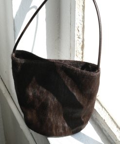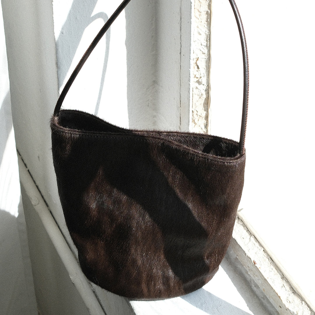 Small cow hair bucket bag with interior wall pocket and magnetic closure.
